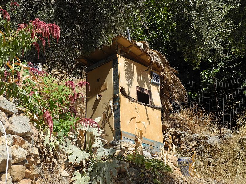 In der biologischen Toilette auf der Terrasse oberhalb der Jurte trennen zwei verschiedene Auffangsmulden die Exkremente vom Urin, was eine gewisse Sorgfalt bei der Benutzung erforderlich macht. Der Urin wird über einen Schlauch auf eine weiter unten liegende Terrasse geleitet, während die Exkremente in einer Tonne gesammelt werden. In trockenem Zustand und geruchsfrei können diese später als Dünger verwendet werden.